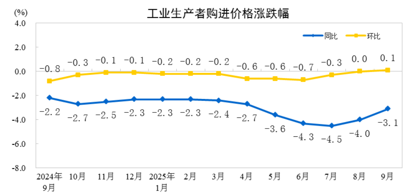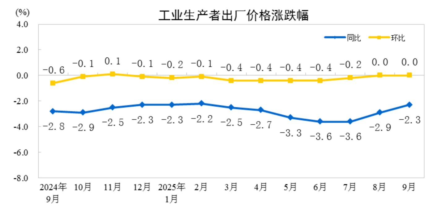 2025年9月份,全国工业生产者出厂价格同比下降2.3%,降幅比上月收窄0.6个百分点,环比继续持平。工业生产者购进价格同比下降3.1%,降幅比上月收窄0.9个百分点,环比上涨0.1%。1—9月平均,工业生产者出厂价格比上年同期下降2.8%,工业生产者购进价格下降3.2%。