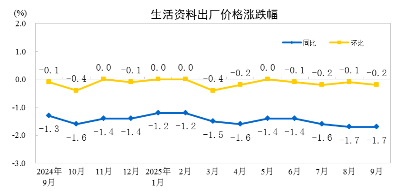 9月份,工业生产者出厂价格中,生产资料价格持平。其中,采掘工业价格上涨1.2%,原材料工业价格持平,加工工业价格下降0.1%。生活资料价格下降0.2%,影响工业生产者出厂价格总水平下降约0.04个百分点。其中,食品价格下降0.1%,衣着价格持平,一般日用品价格上涨0.2%,耐用消费品价格下降0.4%。