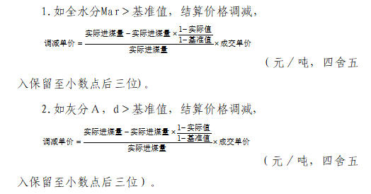 2.如(基准值-100)≤Qnet,ar<基准值,以基准值为基础,每降低1千卡/千克,结算价格调减单卡价格的1.0倍。