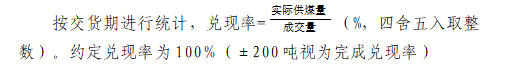 (一)销方因自身原因导致兑现率低于100%,除按质量考核条款考核外,还将进行兑现率考核,考核金额=成交量×(100%-兑现率)×成交价×5%,从保证金中扣除。
