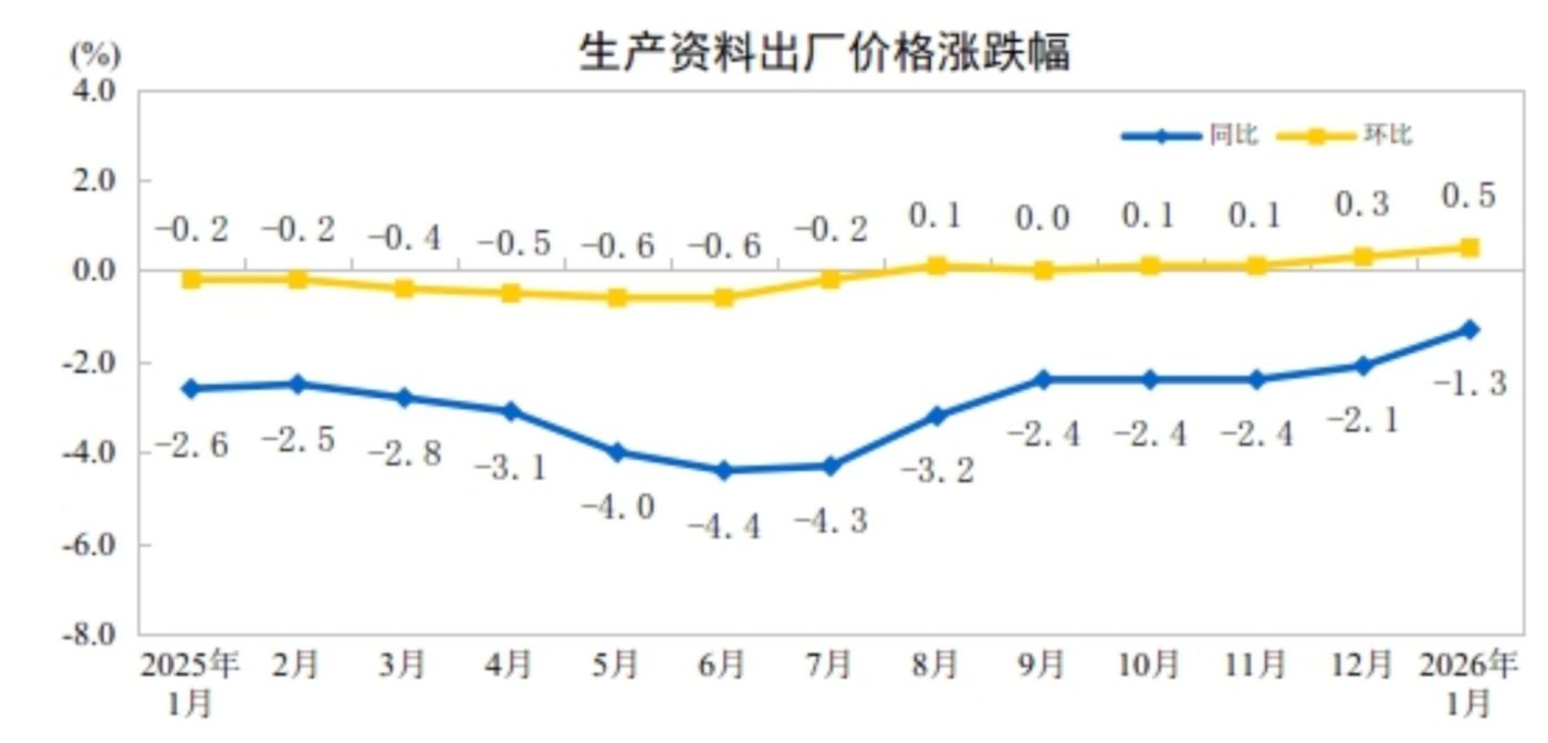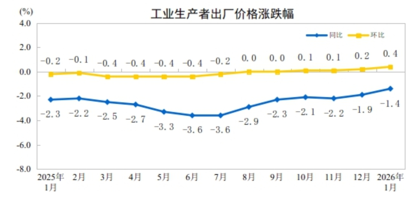 2026年1月份,全国工业生产者出厂价格同比下降1.4%,降幅比上月收窄0.5个百分点;环比上涨0.4%,涨幅比上月扩大0.2个百分点。工业生产者购进价格同比下降1.4%,降幅比上月收窄0.7个百分点;环比上涨0.5%,涨幅比上月扩大0.1个百分点。