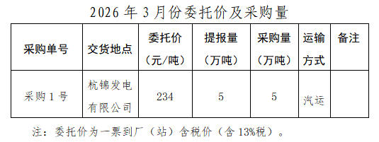 内蒙古能源集团有限公司计划对所属杭锦发电有限公司2026年3月市场煤采购进行电子专场交易,交易信息现对外公开发布,凡符合条件的交易商均可参加。