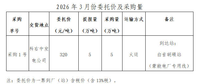 内蒙古能源集团有限公司计划对所属内蒙古能源发电科右中发电有限公司2026年4月电煤采购进行电子专场交易,交易信息现对外公开发布,凡符合条件的交易商均可参加。